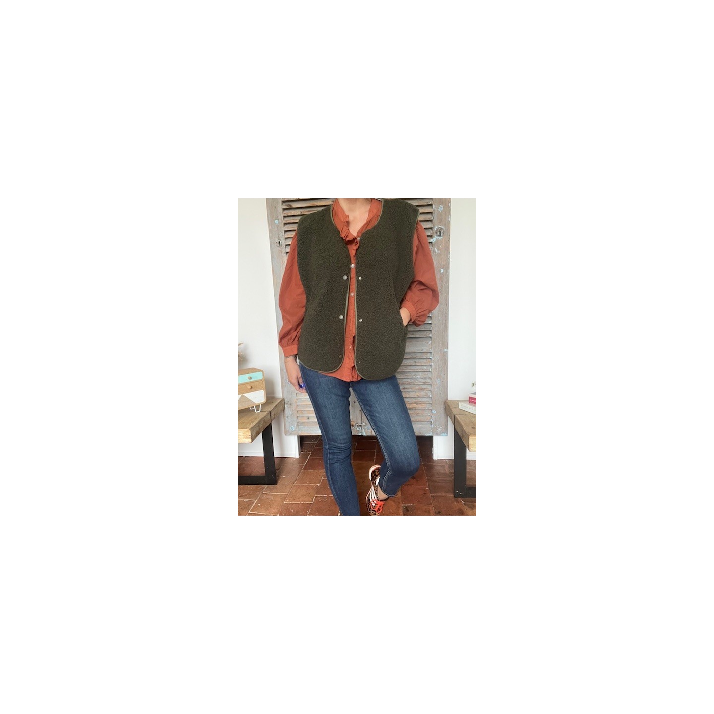 Je la porte avec le jean slim TISON et le gilet sans manches en laine d alpaga ou avec la veste sans manches en bouclette kaki