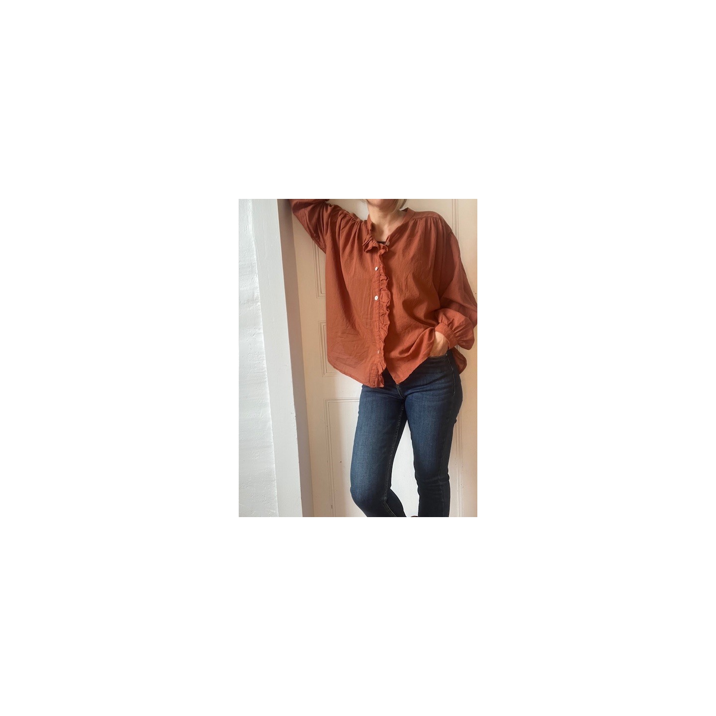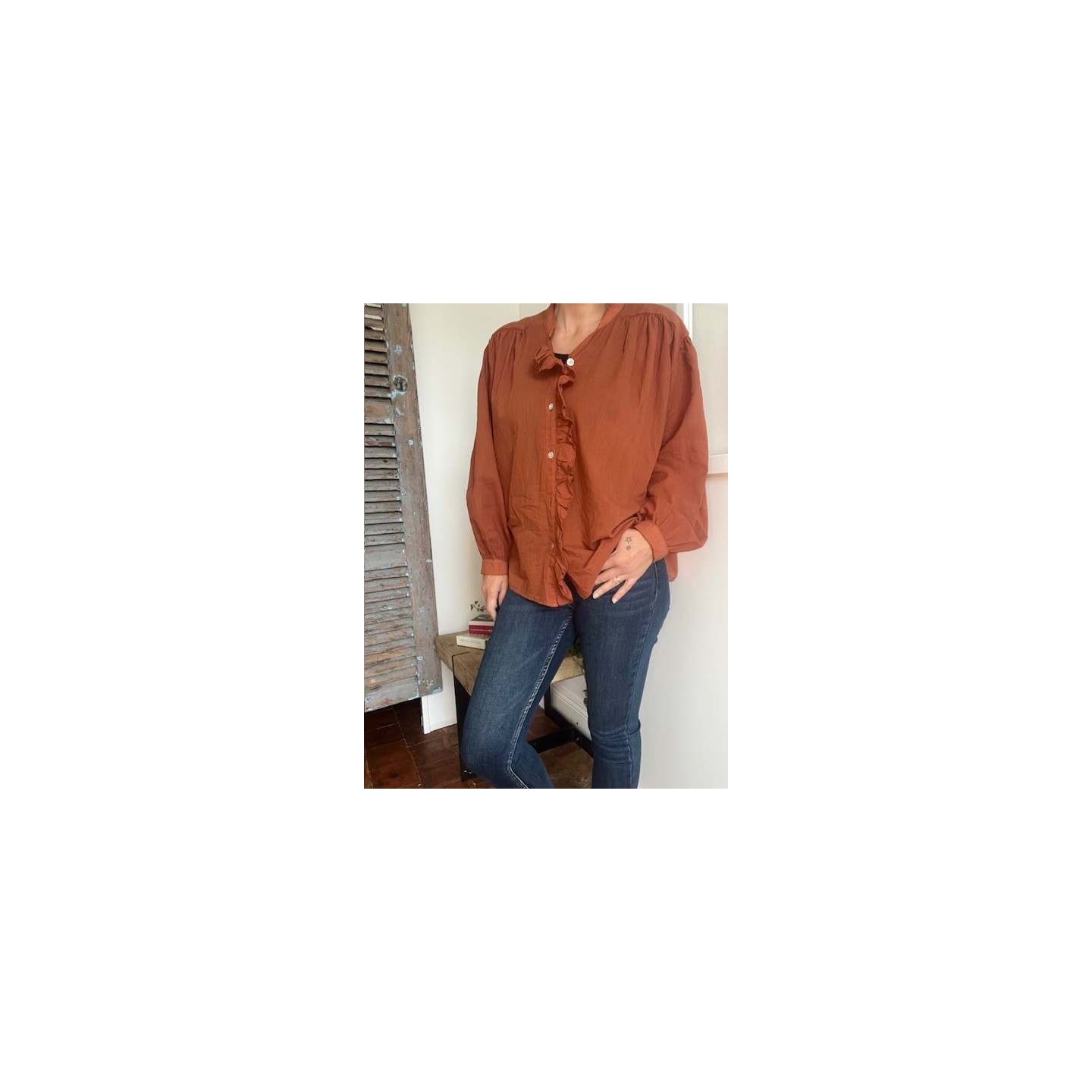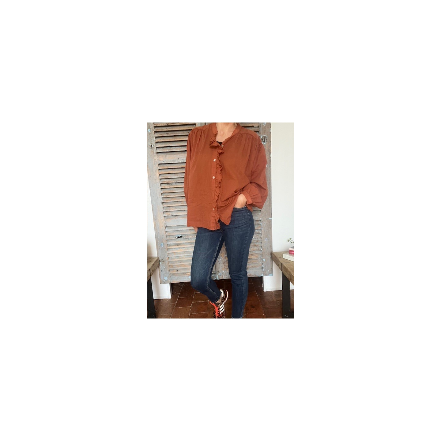 Apporte une touche de chaleur et de féminité à ton dressing avec la chemise terracotta .