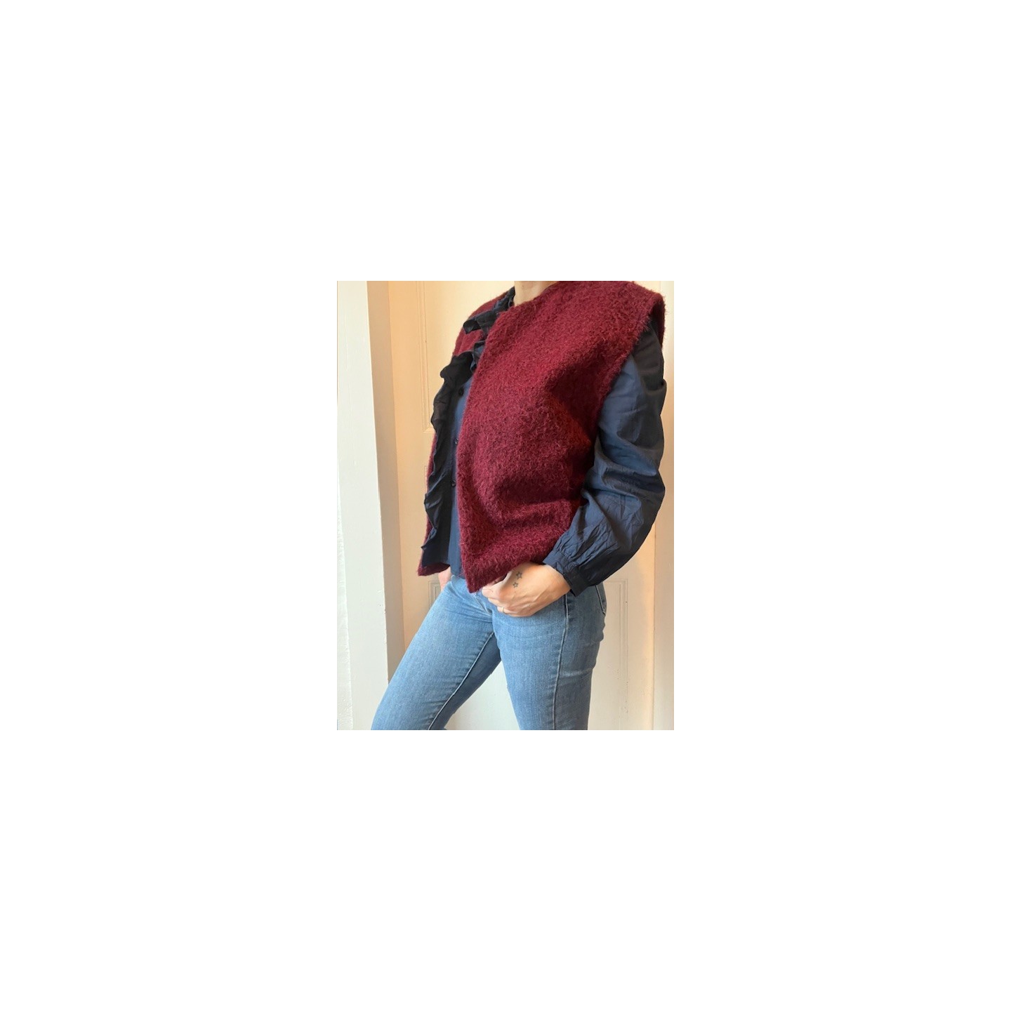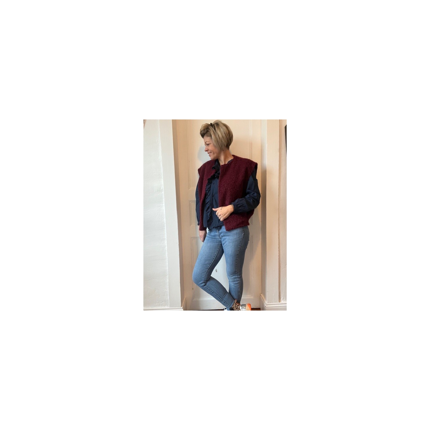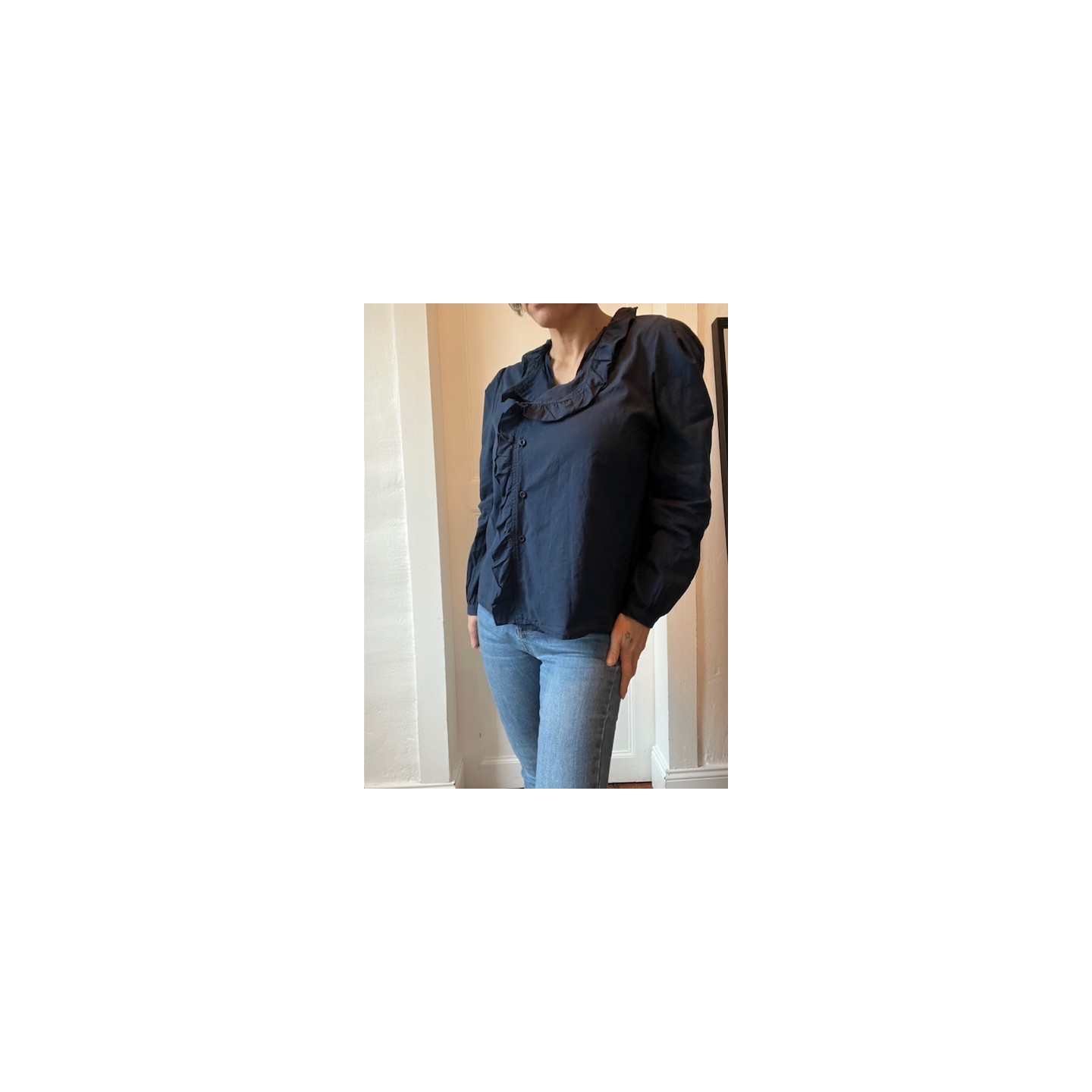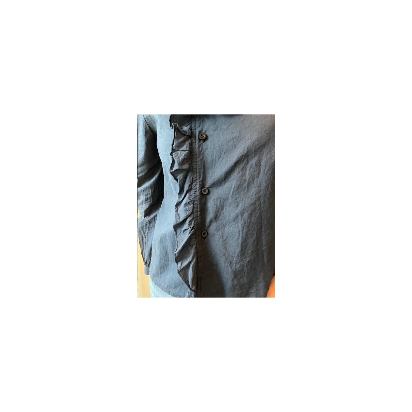 Sublime et raffinée , cette chemise Bleu marine avec ses petits volants délicatement placés le long de la patte de boutonnage est la pièce parfaite pour un look naturel et élégant .Facile à associer , elle se porte aussi bien avec un jean pour un look casual chic qu'avec une jupe pour une allure plus habillé.