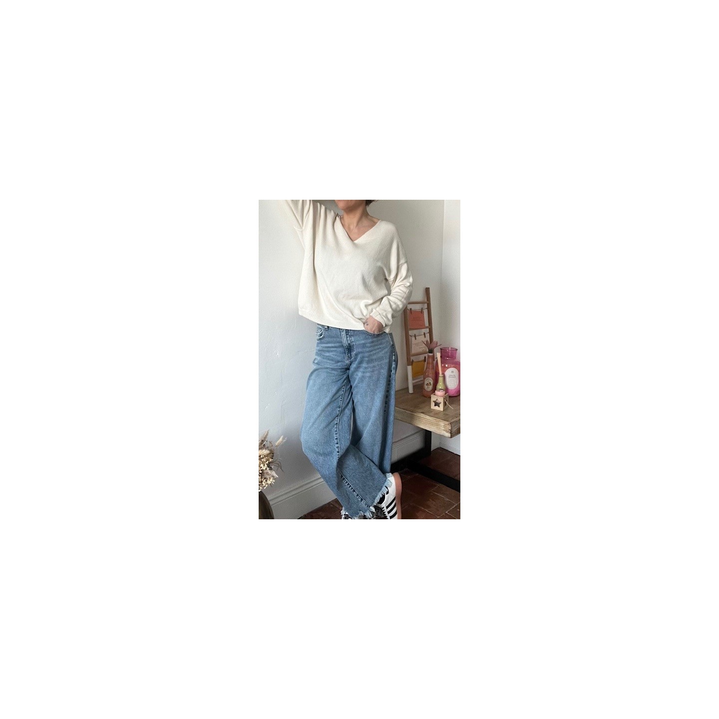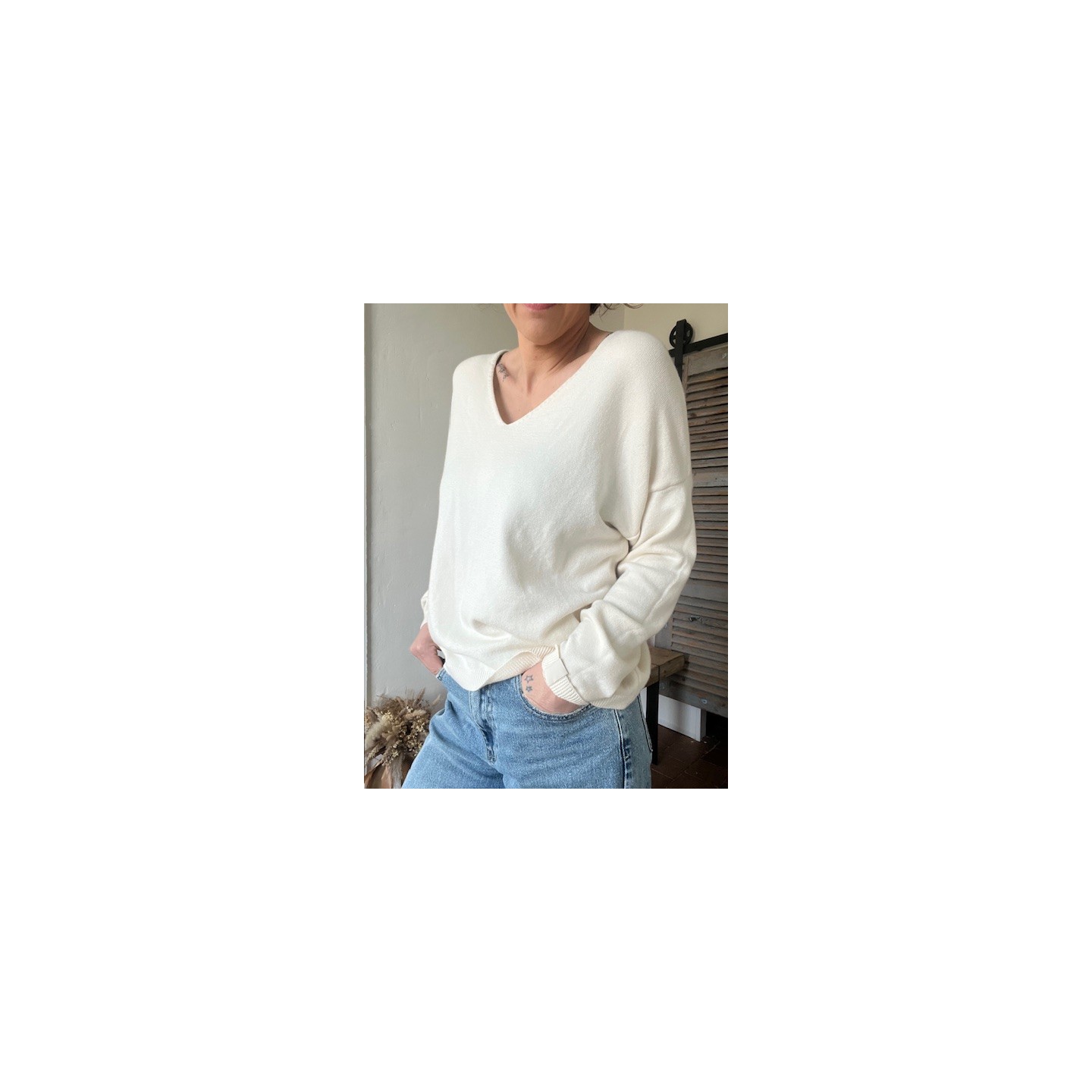Le pull col V le basique à avoir dans son dressing .Pièce essentielle dans sa garde robe .Sa coupe fluide et féminine met en valeur la silhouette .Sa teinte beige naturelle en fait un indispensable facile à porter .Accompagne le d'un jean ou d'un pantalon fluide , il sera parfait ..